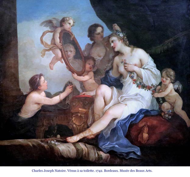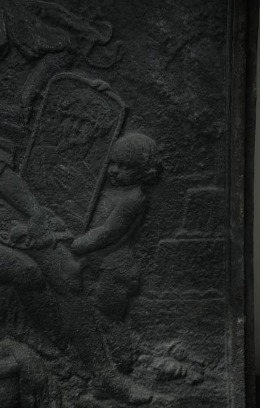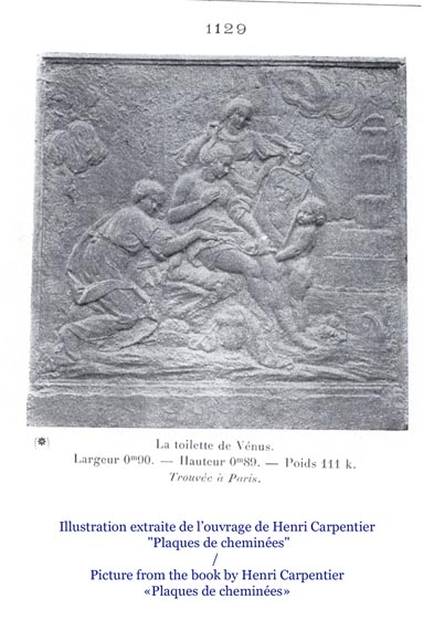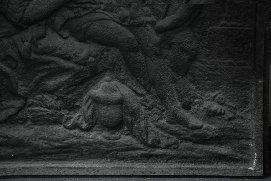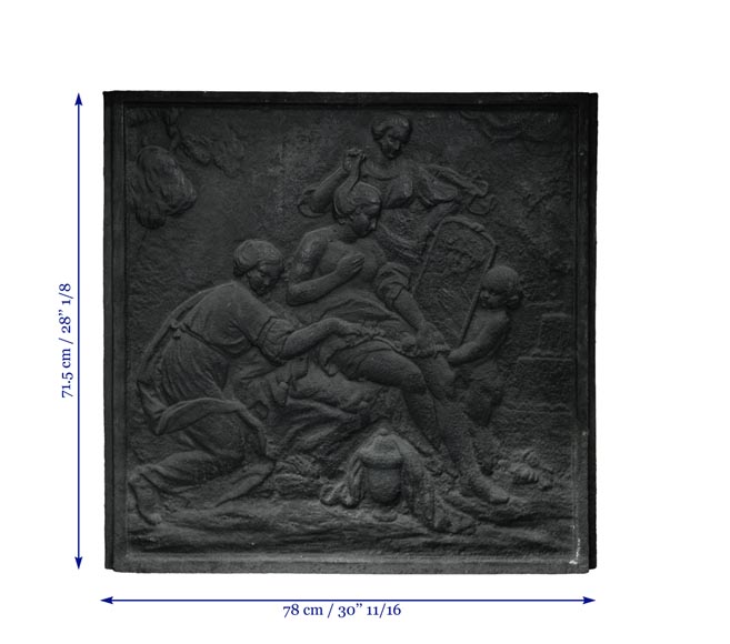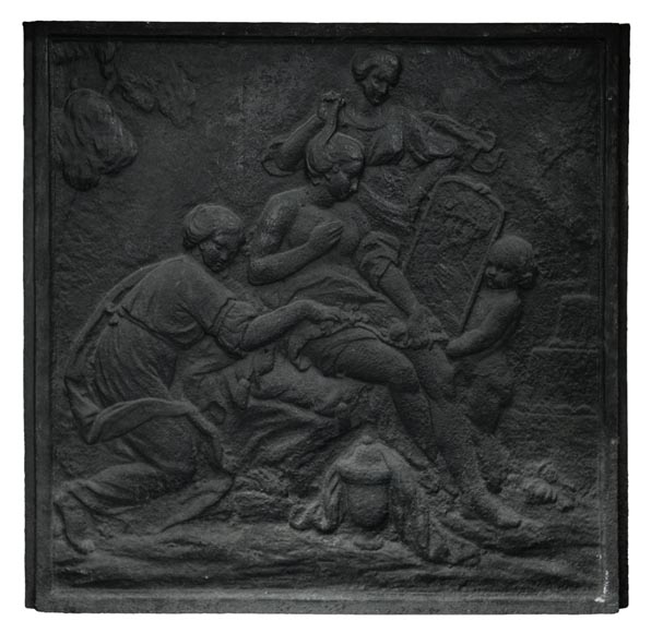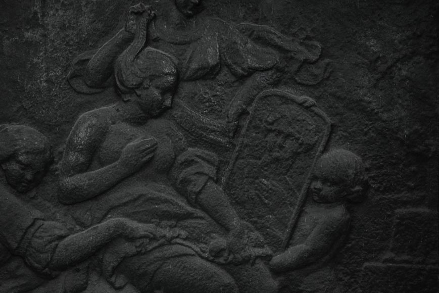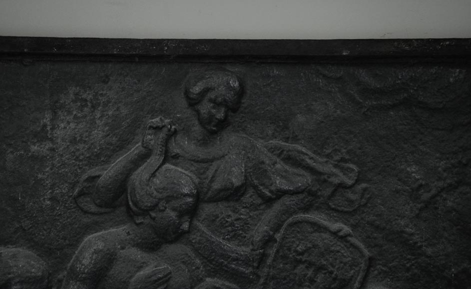 This antique Louis XV style cast iron fireback was made in the 18th century. It represents The toilet of Venus : surrounded by her maids, the goddess takes a look in the mirror. It is a mythological theme often represented in art, as on this painting by Charles Joseph Natoire exhibited in Bordeaux and whose this fireback seems inspired as the compositions are similar.