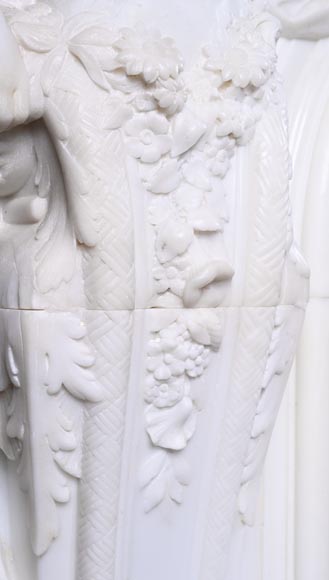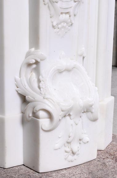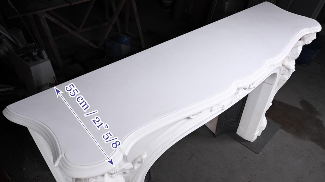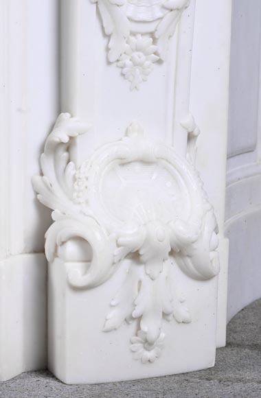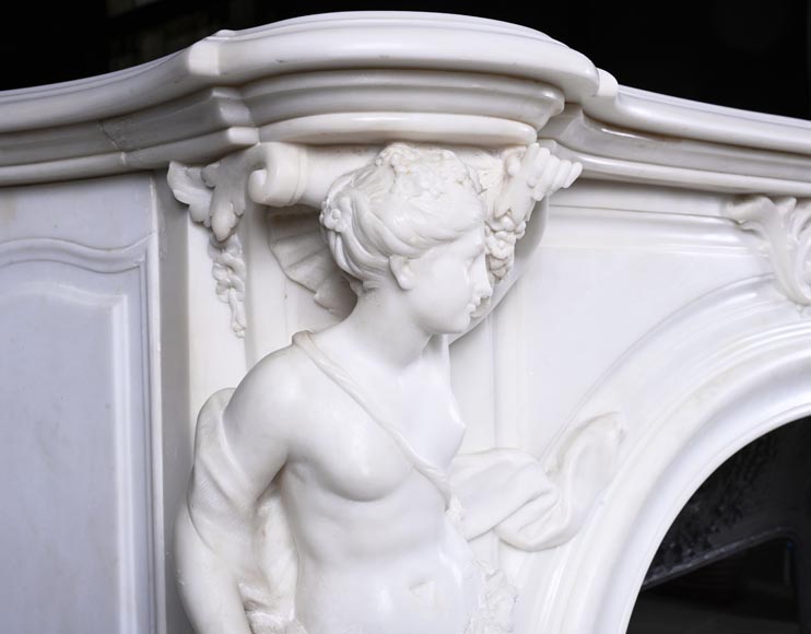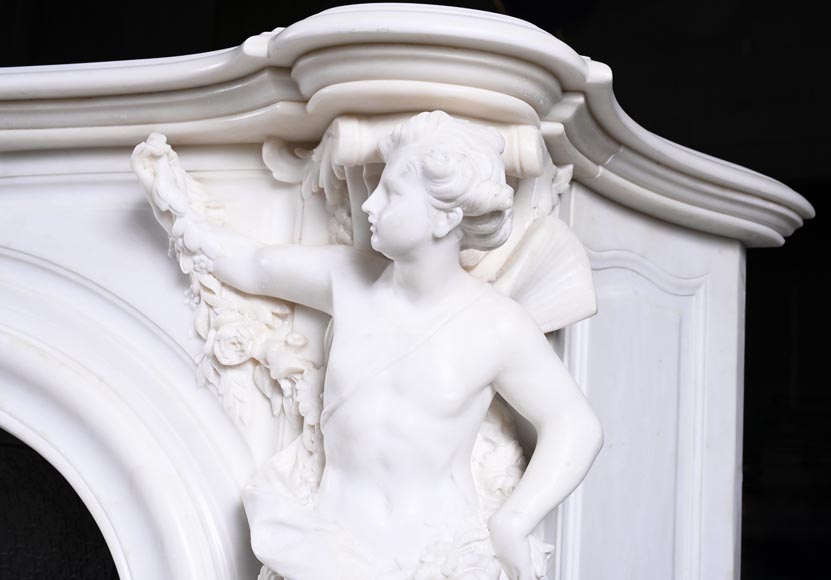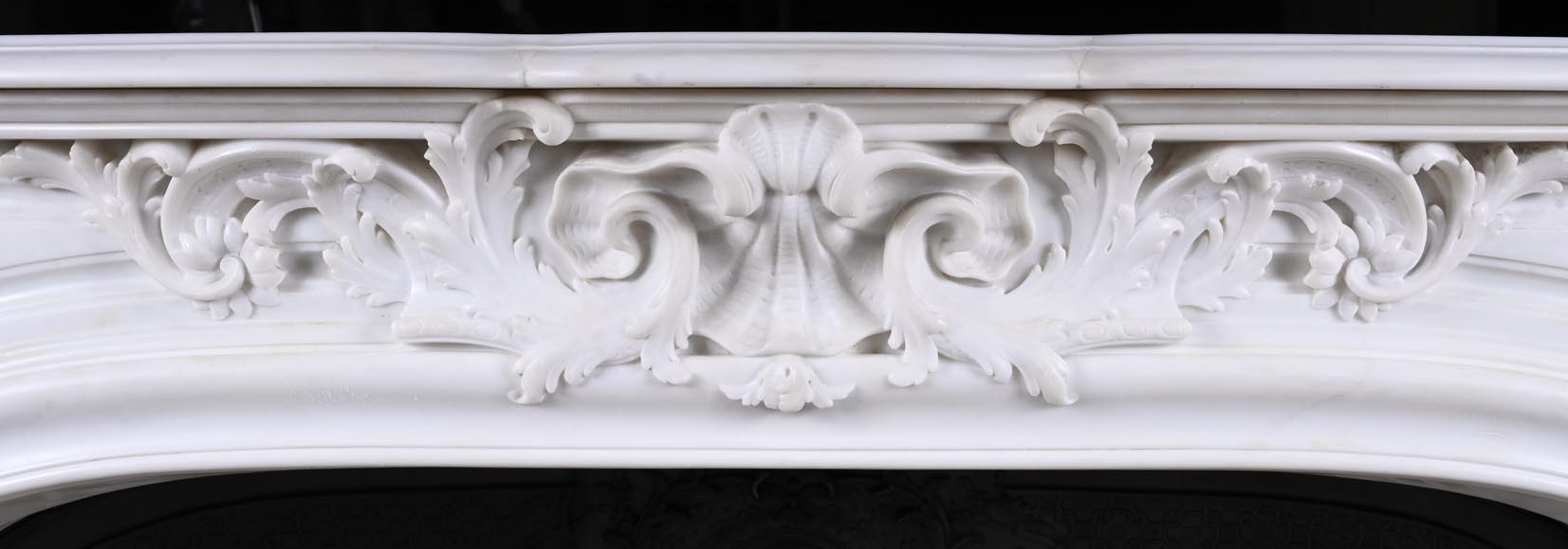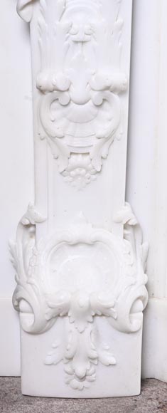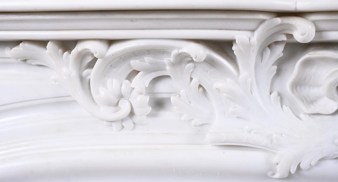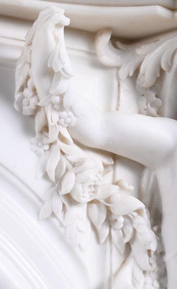 This statuary marble fireplace is a replica of the fireplace created in 1747 by Jacques Verberckt, sculptor, and Jacques Caffiéri, “sculptor, founder and chaser to the King”, for the Dauphin’s Bedchamber at the Château de Versailles. This example, however, is entirely carved in marble, whereas the original model was made in red marble and enriched with gilt bronze decoration.