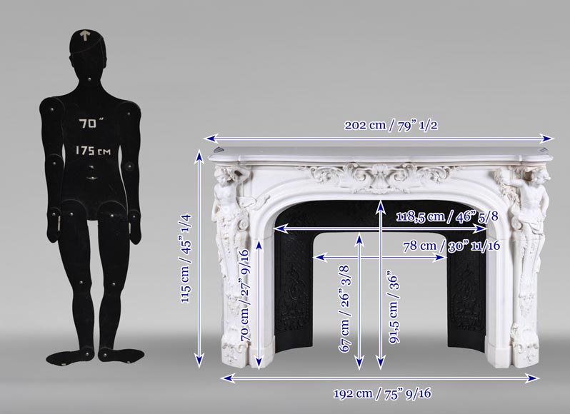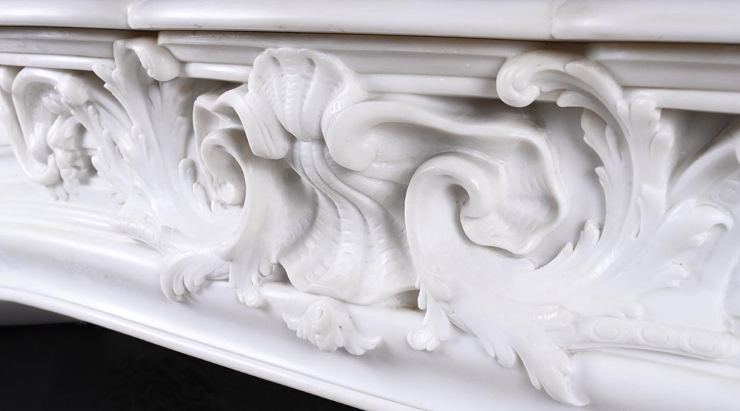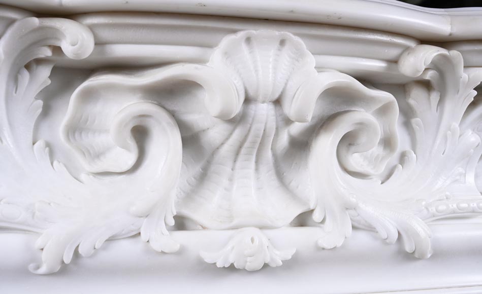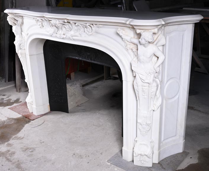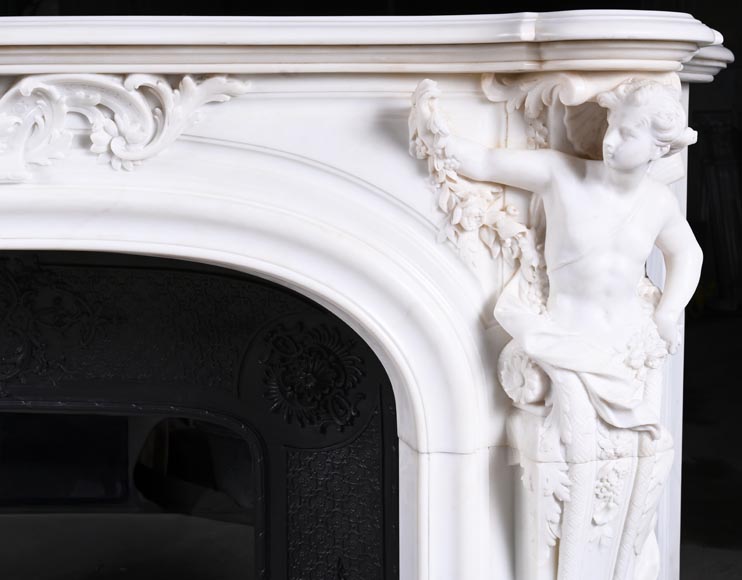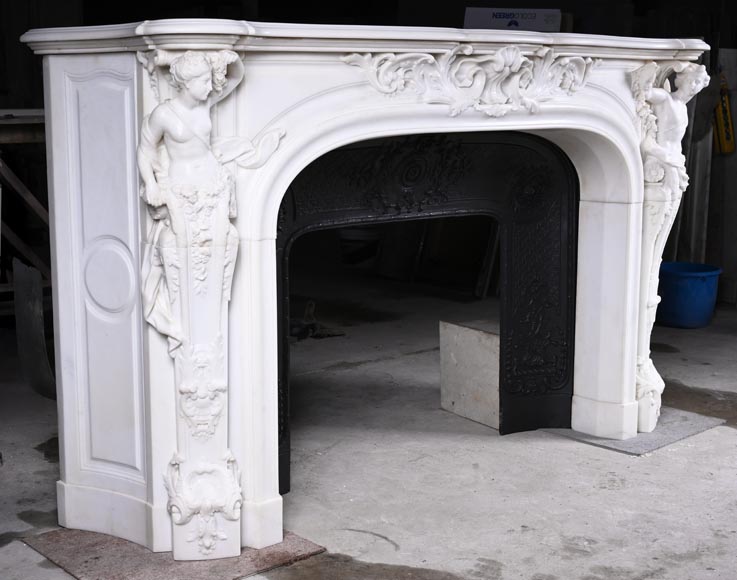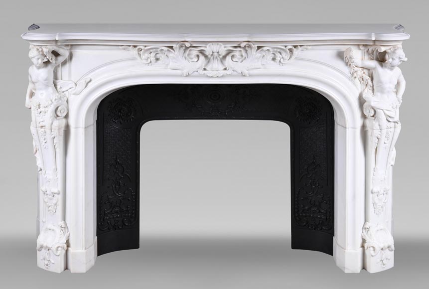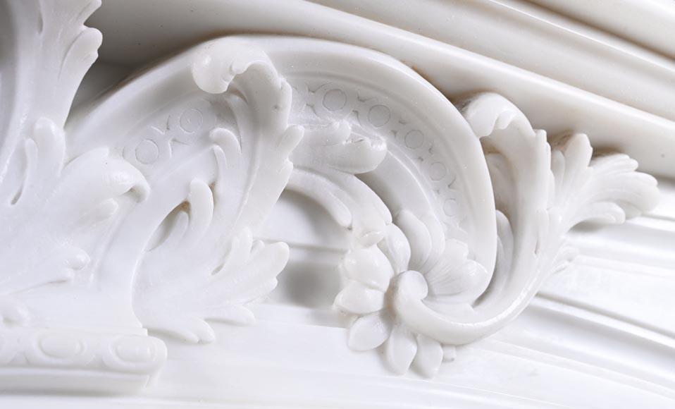This statuary marble fireplace is a replica of the fireplace created in 1747 by Jacques Verberckt, sculptor, and Jacques Caffiéri, “sculptor, founder and chaser to the King”, for the Dauphin’s Bedchamber at the Château de Versailles. This example, however, is entirely carved in marble, whereas the original model was made in red marble and enriched with gilt bronze decoration.