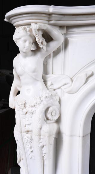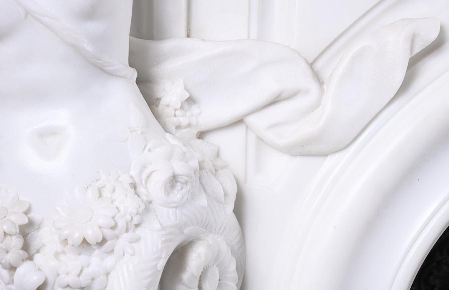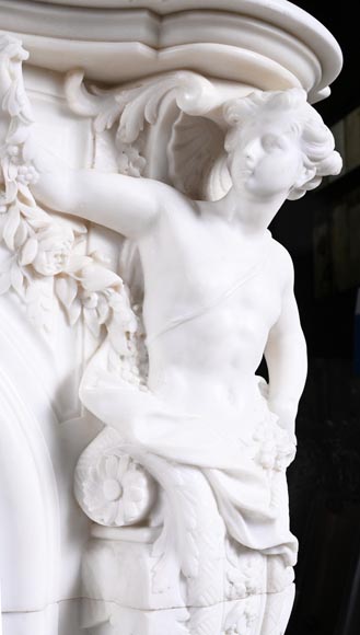 "Flora and Zephyr", an exceptional fireplace based on the model of the Dauphin's Room at the Palace of Versailles and that of the Golden Salon at the Élysée Palace, sculpted in Statuary marble at the end of the 19th century.