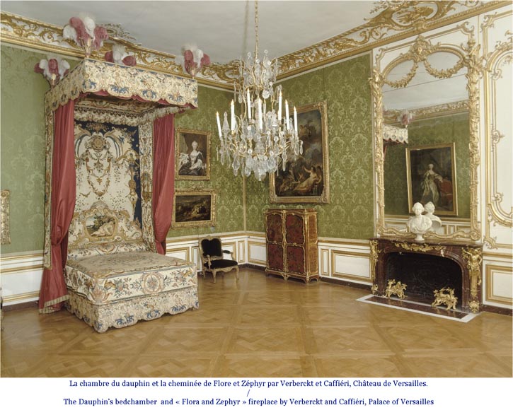 The Dauphin’s Bedchamber at the Château de Versailles was entirely redecorated in 1747 under the direction of the King’s First Architect, Ange Jacques Gabriel, and fitted with a red Campan marble fireplace whose design was conceived by Jacques Verberckt, who was also responsible for the sculpted decoration of the apartments. The sculpture and the bronzes of the fireplace were executed by Jacques Caffiéri, the most important bronzier of the reign of Louis XV.