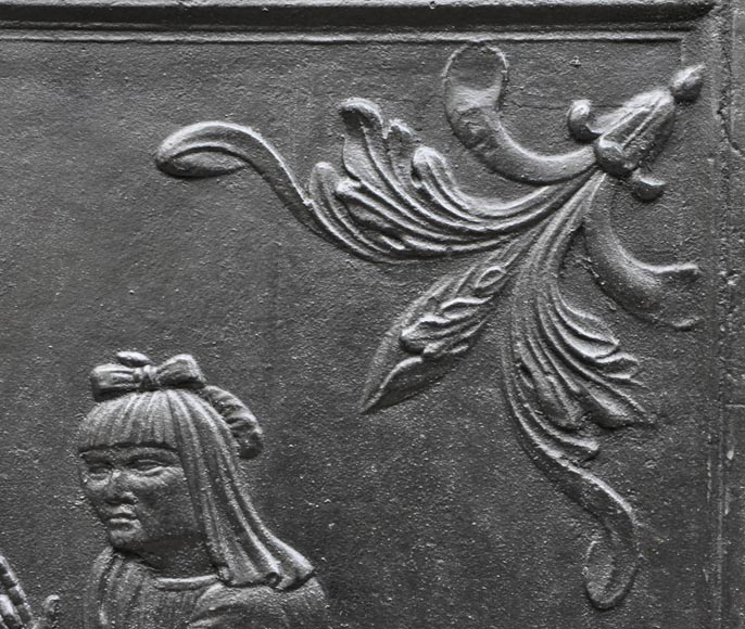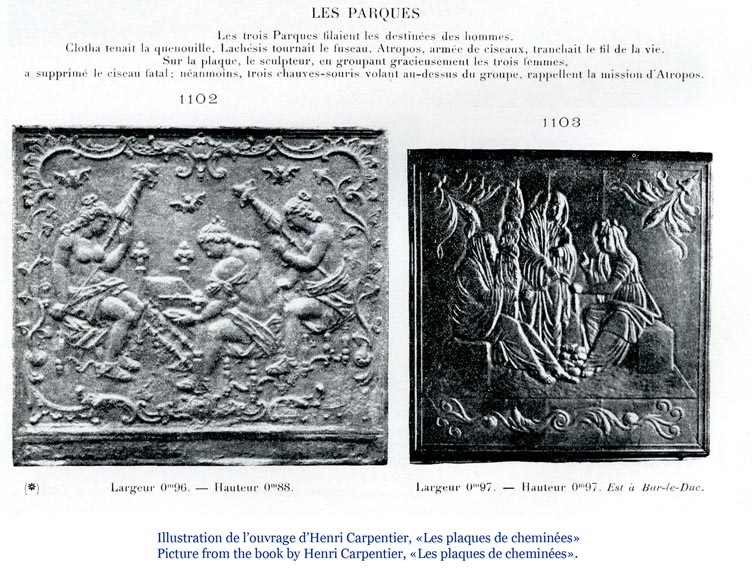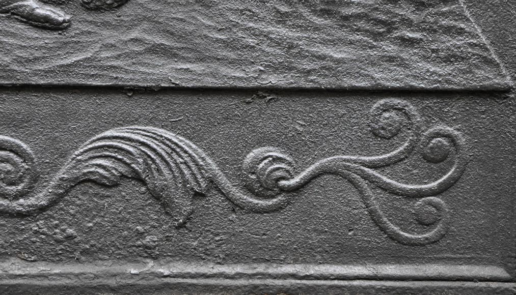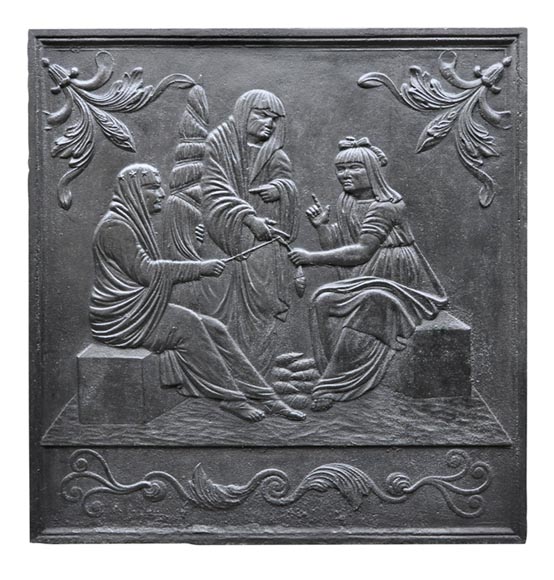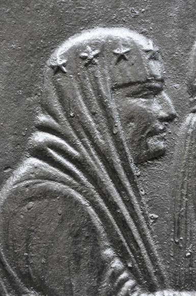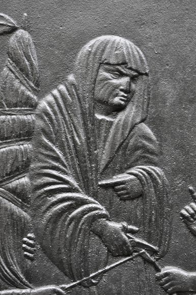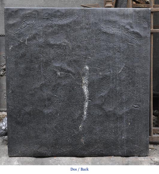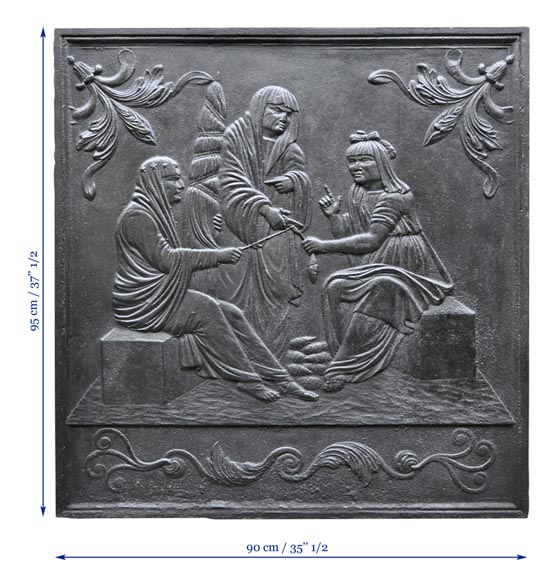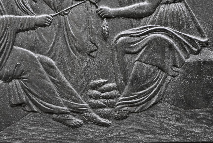 Featuring a square shape this large antique fire back was made during the 18th century. The three Parcaes are portrayed shadowing the destiny of men. Clotho holds a cattail, Lachesis is turning the spindle, Atropos, armed with scissors, cutting the thread of life.