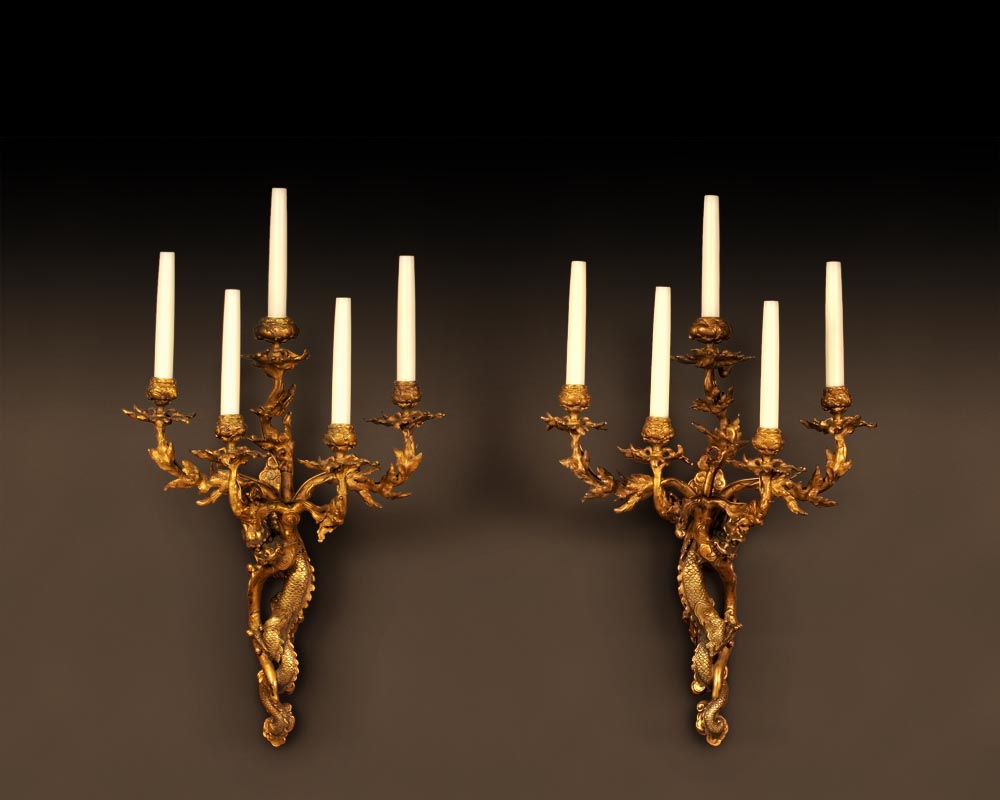 "The Dragons", Rare pair of gilt-bronze wall sconces in the Japanese taste