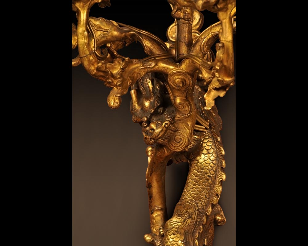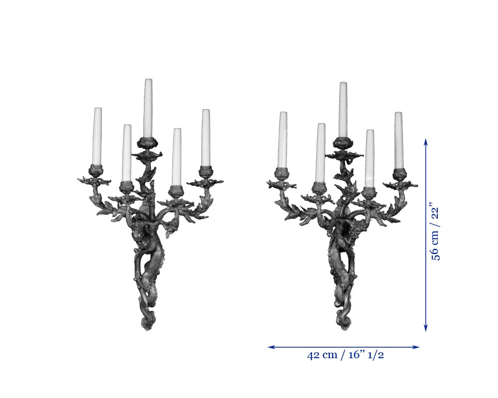 A dragon in the Chinese style gracefully wraps his slender body around a branch of stylized branches. The inspiration for these sconces comes from the Orient, more specifically China, and they express the taste for Oriental art in vogue at the end of the 19th century. This was the result of the opening of Asia to the West, through their participation in international exhibitions, as well as the collections that were formed by wealthy and enlightened art collectors, such as Henri Cernuschi or the Empress Eugénie who installed a Chinese Museum at Fontainebleau. These contacts meant there was a new decorative repertory, greatly appreciated, that the designers of the 19th century could draw upon when creating elegant new objects for their clientele.