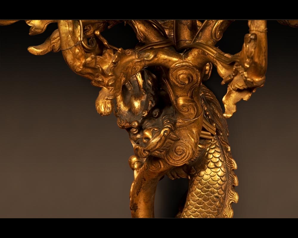 The stylized cloud motif around the dragon and the head of the monster are also characteristic of this same source of inspiration, which encouraged decoration that was both elegant and sophisticated, and was emblematic of a refined lifestyle. Such works integrated perfectly in the distinguished interiors of connoisseurs and lovers of Asian art of the period.