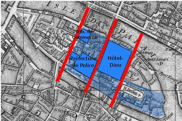 Under the Second Empire, the development of western Paris was reinforced by the construction of streets and parks such as the Bois de Boulogne and the Parc Monceau. Haussmann shifted the center of Paris westward toward the Opéra and the new boulevards. He transformed the Ile de la Cité and its surroundings to accentuate the magnificence of the city center's monuments and administrative buildings by isolating them. He created large spaces around monuments like the Hôtel de Ville, the Louvre, the Palais de Justice, and Notre-Dame. The parvis, the open area in front of Notre Dame (Illustration 7), was created at this time, spanning over 40 times more space than it had in the 12th century. According the David P. Jordan, French History scholar, the Ile de la Cité is the best example of the haussmanisation of Paris (Illustrations 8 and 9).