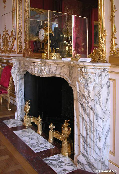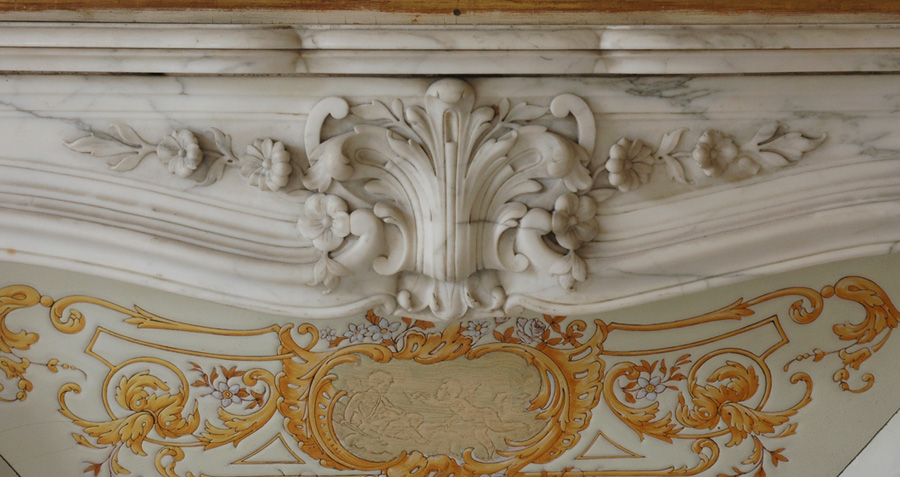 The monumental fireplace made out of Arabescato marble, in the Senate of Luxembourg's conference room is another masterpiece. An exceptional antique Louis XV fireplace decorated with three shells was also made out of this marble for the Princess's Parade Bedroom at Soubise Hotel.