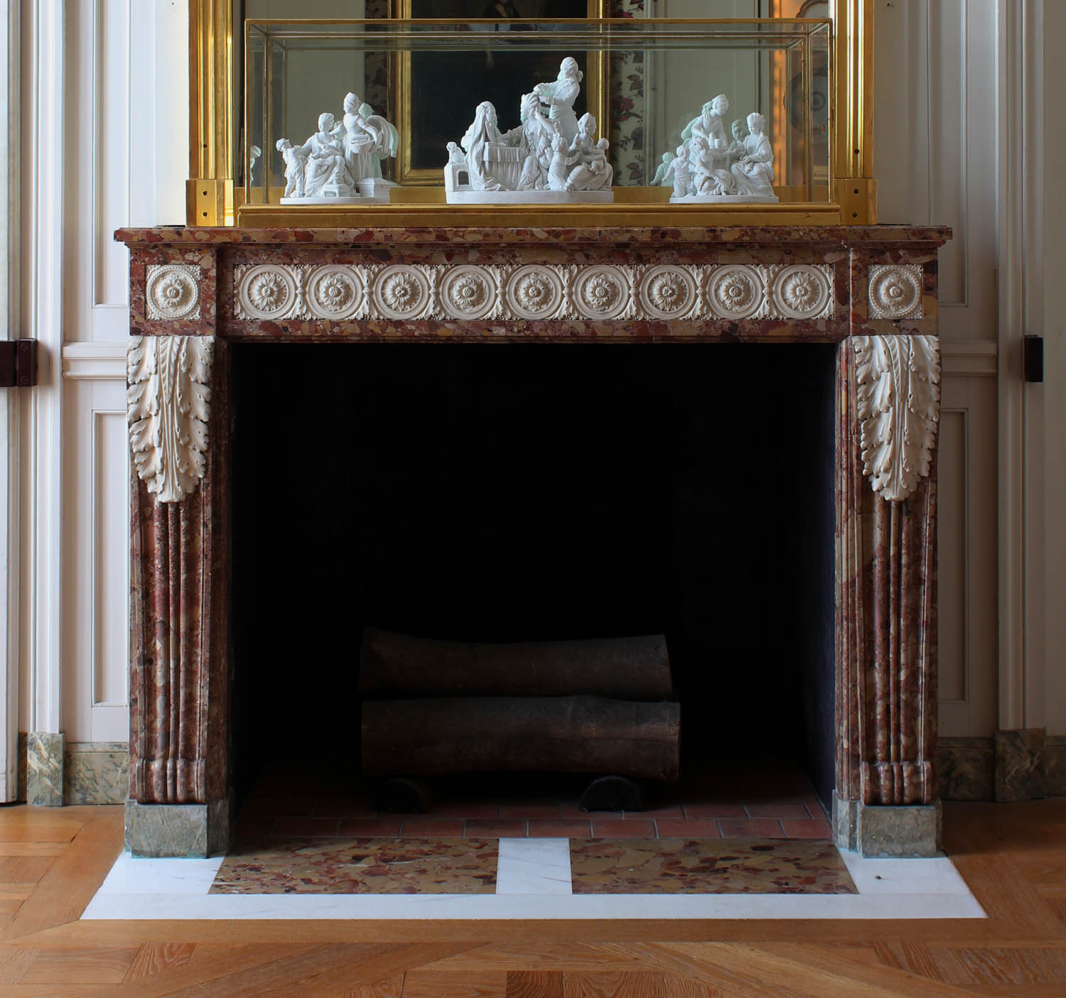 A very beautiful antique Regence style fireplace decorates the salon of the Grande Singerie at Château de Chantilly.