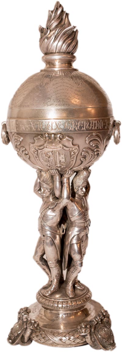 Émile Leysalle became a member of the association of Vieux Grenadiers in 1883 and for this group he made a silver cup of 45 cm in height, and weighing three kilos. The cup features an enflamed grenade carried by three grenadiers, and is inscribed with the names of the members of the circle as well as their motto : Family, friendship, homeland. It was presented during the Universal Exhibition of Zurich in 1883.