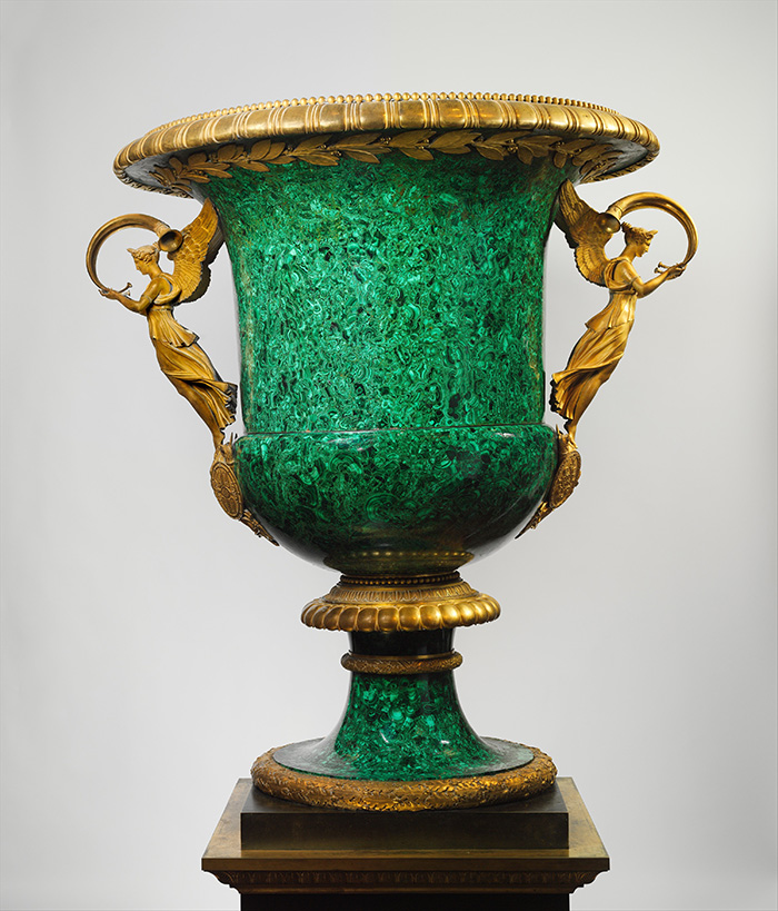 The Demidoff Vase, made in 1819 by the sculptor and bronzemaker Pierre-Philippe Thomire in malachite veneer and gilt ormolu, is a superb example of fire-gilding. This vase, almost two meters high, was ordered by Count Nicolas Demidoff to furnish Villa San Donato, his residence near Florence, Italy. The vase is now preserved at the Metropolitan Museum of Art in New York.