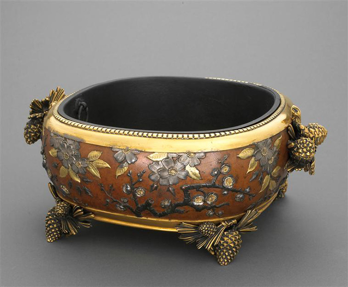 Fire-gilding (also known as Mercury-gilding or Wash-gilding) is a mixture of mercury and molten gold. Mercury, the only metal with liquid form at room temperature, has the property of dissolving gold. The amalgam created by mercury and gold is applied on the object made of perfectly sanded metal which is then heated in the oven or with a blowtorch. Thanks to the heat, the mercury will evaporate completely (if it is not completely evaporated, it forms whitish spots). Finishing stage can be done by burnishing or scratch-brushing.