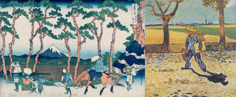 In painting, Edouard Manet, Mary Cassatt, Degas, Van Gogh, Gauguin were among those who were deeply inspired by Japanese art, affected by the lack of perspective and shadow, the flat areas of strong colour, the compositional freedom in placing the subject off-centre, with mostly low diagonal axes to the background. The Japanese iris, peonies, bamboos, kimonos, calligraphy, fish, butterflies and other insects, the blackbirds, cranes and wading birds, the cats, tigers and dragons were endless sources of inspiration, appropriation and reinterpretation for European artists. The occidental productions were combining styles and artistic conceptions instead of copying Japanese art slavishly. That is what brings to light the comparison between the artworks of Kitagawa Utamaro and Degas, of Katsushika Hokusai and Van Gogh (pictures 1 and 2).