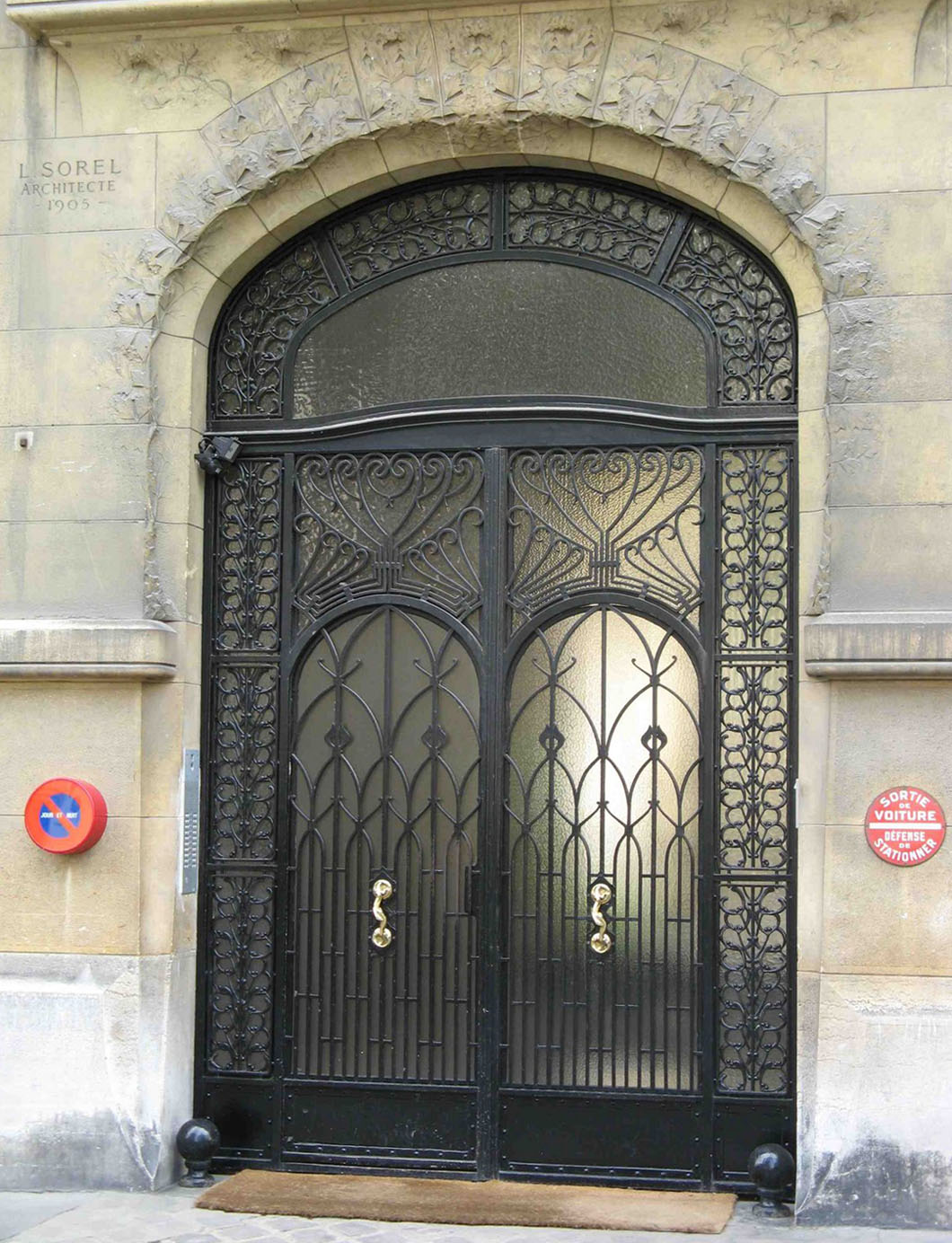 In 1904, he built a building situated on 9 rue Le Tasse in Paris for Mr. Perrier. His friend Plumet had been using loggia arches for a long time, a feature that became very characteristic of his work. Sorel shamelessly copied the idea, and used it as the main decorative element of a very bourgeois building, with remarkable symmetry. He added a bit of colour to its façade by using vast red bricks. The detail on the metalwork and sculptures is remarkable. The main door, still considered an architect's bravura piece in the 1900s, has a particularly elegant doorknob, where two salamanders tenderly intertwine. The sculptures on the façade, follow the well known plant repertoire of the Art Nouveau style, and were made by Pierre Seguin.