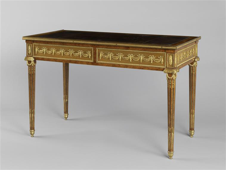 The seats were numerous, often less comfortable than under Louis XV, but finer and more harmonious. Like often in the furniture of this period, its legs had the shape of a column, fluted or in spiral, that is thinner at the base. The back was rectangular or oval, and sometimes they were partially opened to figure a lyre, a balloon or even a basket. The cylinder desk, from which the top rolls into the piece of furniture when the desk is opened, were in vogue. The cabinetmaker Riesener, undisputed master of Louis XVI’s furniture, made several ones for the king. The window displays appeared at that time when art began to be available to more people. The use of gilt bronze was massive, and today this production is one of the most rated of the 18th century. The pendulums, adorned with allegorical characters and with shapes often taken from architecture- obelisks or even triumphal arch- flourished extremely fast and decorated the fireplaces. The taste for the wallpapers appeared, and the Queen diffused them to the Court to brighten the insides, under the aegis of the important Reveillon manufactory, which was situated in Paris, near the Bastille .