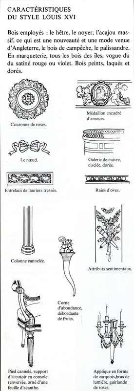 Thus, antique motifs and the liking for nature came together into architecture, interior decoration and furniture: rustic and sentimental symbols were combined with the rigorous Antiquity, under the influence of the philosophers Rousseau and Diderot. Many ornaments were borrowed from flora, and this love for nature appeared into decoration by the presence of a wreath of roses, baskets, palmettes, bows and ribbons inspired by the “taste for Nature”, sheaves of wheat mixed with meadow flowers, or even some gardening tools, hats of shepherdesses, or sickles. These motifs were mingled with the antique repertoire in which one can find trophies, greek friezes, friezes of pearl of hearts and hearts, stylized acanthus leaves. Their success depended on the sensibility of the artist who needed to adapt an idea of Antiquity, which would be source of all perfections, to buildings or furniture units of a complete different context.