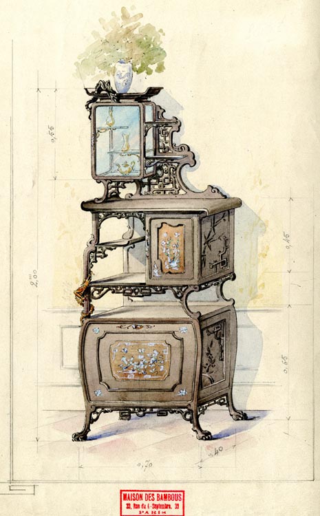 Towards the end of 1894, Perret and Vibert changed their shop at rue du Quatre-Septembre by creating ten new rooms, which were used to exhibit their Japanese and Chinese inspired furniture.