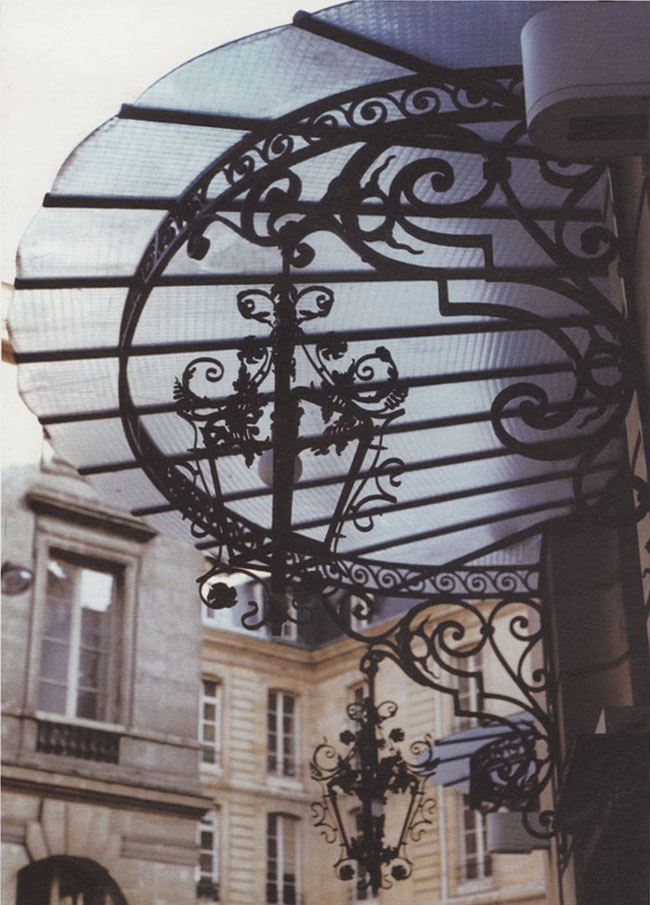 It is hard today to find references of the first marquises, but there are some Renaissance style marquises that are elaborately decorated. Some bigger and more elaborately decorated marquises belong to the Louis XIV style. Louis XV marquees were elegant with curved belts and highly adorned brackets, while the Louis XVI style developed a high level of refinement in the design of their broad glass panes and artistry of the wrought iron work. At first reserved to inner court yards, marquises were not found adjoined to the exterior facades of buildings until the end of the 19th and early 20th centuries. Parisian facades were embellished with extraordinary wrought iron marquises as the rigid Haussmanian architectural law subsided. They were placed above the entrances of homes and hotels, theaters, cafes and restaurants but most famously above the stairways of Hector Guimard’s Metro station.