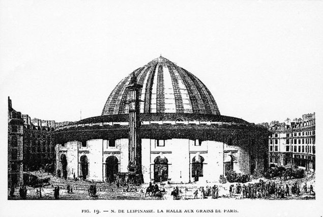 The first metal bridge to be built in Paris was the Pont des Arts, between 1801 and 1804, during the First Consul. Another example of the first metal architectures could be the reconstruction of the cupola of the Corn exchange building that had been destroyed by a fire in 1802. Architect François-Joseph Bélanger and engineer François Brunet were commissioned to rebuild the roof and by 1811 a new cupola made of iron covered with copper leaves shined above the building. In 1838, the copper was replaced by glass. Closed in 1873, the building was allocated to the Chamber of Commerce in 1885 and was transformed into the Commodity market by architect Henri Blondel who covered it with stone.