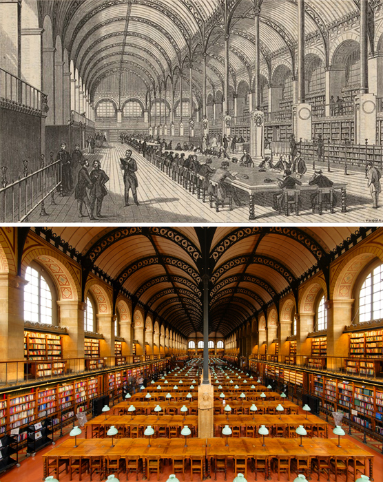 At the mid-century, a debate aroused between the defenders of Eclectisme, who copied past styles, and the rationalists for who iron was a new material which could generate innovations. The Sainte-Geneviève library in Paris built in 1844-151, the Crystal Palace of the World's Fair of 1851 in London, or even the church Saint-Eugène - where slim cast iron columns support the weight of a visible network of ribs - contributed to this new architecture led by Labrouste, Horeau, Boileau and Viollet le Duc.