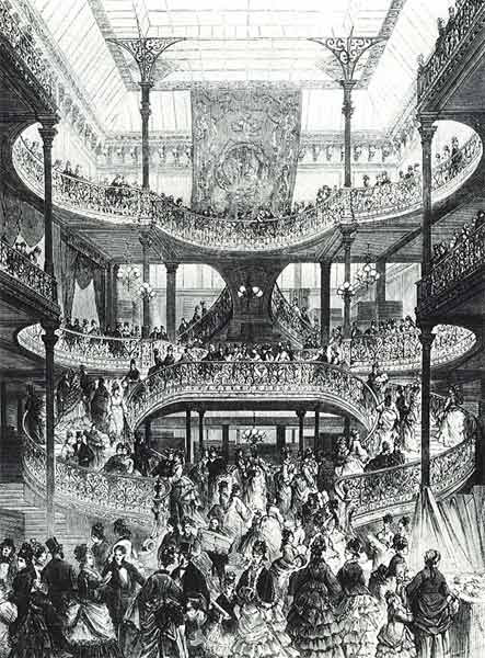Emile Zola who admired metallic architecture became its defender: “Space had been gained everywhere, light and air entered freely, and the public circulated with the greatest ease under the bold flights of the far-stretching girders. It was the cathedral of modern commerce, light but solid, made for a nation of customers. […] and all that iron formed, beneath the white light of the windows, an excessively light architecture, a complicated lace-work through which the daylight penetrated, the modern realization of a palace of dreams, of a Babel-like heaping up of the storeys, enlarging the rooms without end”.