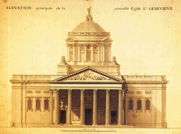 In architecture, this movement is expressed through typical antique architectural features (columns, pediments, elegant proportions, porches). To break with Baroque style, it systematically adopted a geometrical plan, a simplicity of volumes and a sculpted decor reduced to its simplest expression. However, sculpted ornamentations from Antiquity are used as Greek friezes, volutes of foliage, scallops or palm-leaf motifs. The most representative French buildings of this style are the Palace of Compiègne (from 1751), the Sainte-Geneviève church of Paris (1764-1790), or even the Arch of Triumph of the Carrousel du Louvre built by Charles Percier and Pierre-François-Léonard Fontaine (1807-1809).