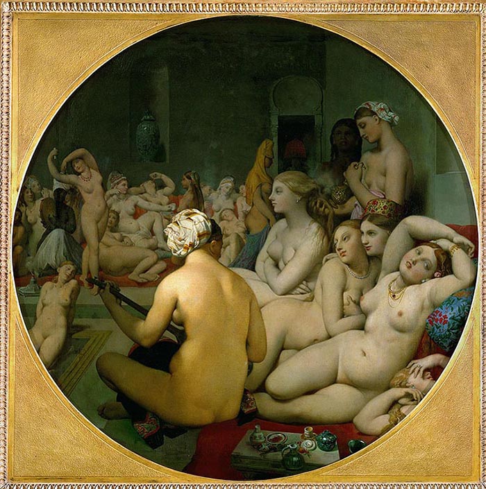 Orientalism, which corresponds to the romantic taste for foreign lands, has given rise to oriental completely fantasized representations and especially as Orientalism has vague geographical and historical boundaries. Realism and ideal are mixed in this new pictorial wave: Orientalism, in other words the Western vision of the East, is born. Algeria for example becomes a source of inspiration with the colonial expansion (Charles X decides in 1830 the French expedition). Delacroix thus paints Women of Algiers: in languid postures, the women have an idle life. Oriental women, indeed, fascinate Europeans. Associated with a provocative and nonchalant sensuality, and a certain mystery imbued with power and charm, they become one of the preferred motifs, whose Ingres is inspired by in his Turkish Bath with the multiply nudes painted according to the classic canons.