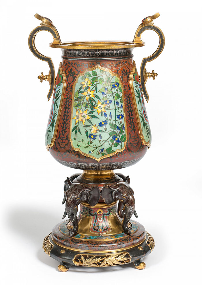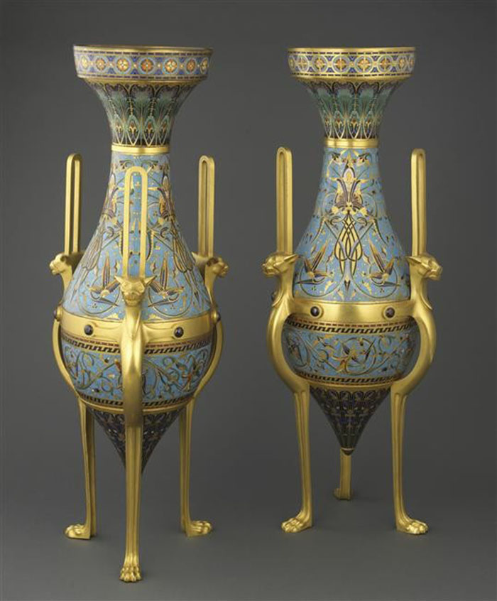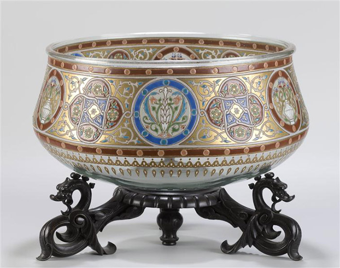 This Bowl, exhibited at the Orsay Museum in Paris, is characterized by a great technicality with its perfect opaque and translucent enamels which rival their Egyptian and Syrian models of the 13th and 14th century. Some of these creations, perfectly inspired by the originals, are sometimes difficult to recognize. However the presence of dragons on the feet, taken from Asian art, is symptomatic of another of the greatest trends of the 19th century: eclecticism. In this same spirit, this Vase "Elephant" made by Christofle and exhibited during the Paris World's Fairs of 1878 and in 1889 presents this double inspiration: the top is Oriental inspired while the foot is Asian inspired.