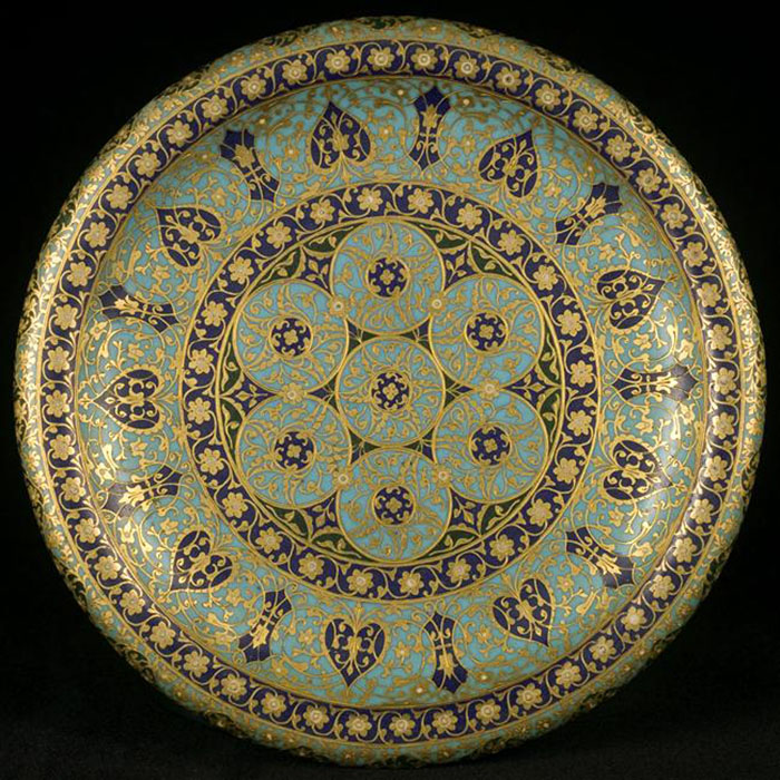 After having widely inspired painting and literature in the first half of the 19th century, Orientalism, thanks to the World’s fairs, spreads out in decorative arts and architecture which take their motifs and their techniques in the Orient. From the World’s Fair of 1867 , Europeans are both tempted and surprised by the many Eastern pavilions, like the one of the Ottoman Empire built by Léon Parvillée. Ceramists and glassmakers in particular, such as Theodore Deck and Philippe-Joseph Brocard, take their techniques and their decorations from the Arab art they want to compete. Inspired by Moorish Spain, now included among the Orientalism, Théodore Deck sepcializes into turquoise ceramics with plant motifs.