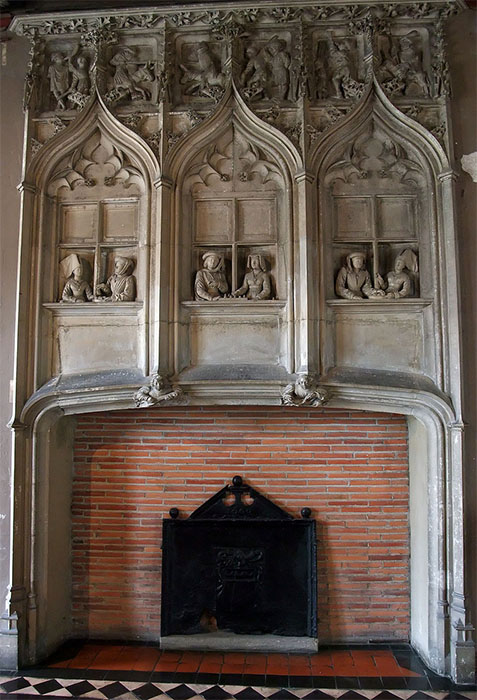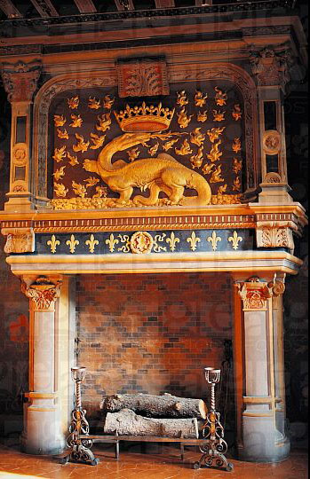 In the Middle Ages, the fireplaces, that first appeared in 9th century, are crowned with massive chimney breasts, sometimes built up to the ceiling, and under which one can stand up, like in the Knight’s Room of the Mont Saint-Michel. The Hôtel Jacques Coeur holds a splendid fireplace whose Gothic breast is in sculpted stone. The top of the fireplace is indeed fit to a sculpted or painted decoration on wood or stone. When the chimney ducts are incorporated inside the walls or outside the buildings in 15th-16th centuries, the mantel gets smaller and accepts a decorative role. The magnificent Renaissance style fireplaces of the Chateau of Blois and of Ecouen illustrate the use of fireplace mantels as a ceremonial surface. Francis I appends his salamander on the mantel, enhanced with gold, which must have been a hypnotic vision in the light coming from the fireplace.
