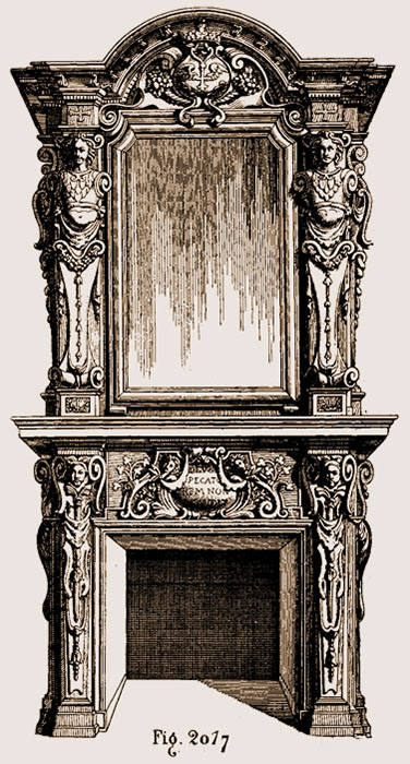 In 17th century, under the development of easel painting, the fireplace mantel and overmantel mirror become two distinctive areas: the mantel still refers to the space surrounding the hearth, topped by a flat shelf, so that the area above is called an "over-mantel". In stone or wood, the overmantel is still joined to the rest. With massive wood sculpted reliefs, the Louis XIII style fireplace creates an opulent frame for the painting above.