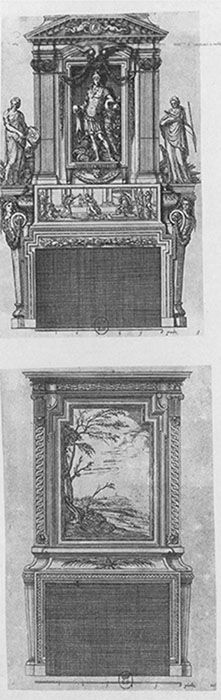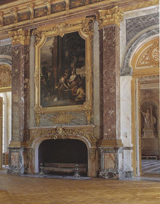With the Louis XIV style, the overmantel serves the Grand Style solemnity. In the Versailles Palace, the illusionists spaces of painting becomes the main element of the overmantel, framed with sculpted ornament, like in the famous Hercules Salon. Jean Marot publishes in 1660 a Book of the Fireplace, illustrated with the numerous variations of the pierglass, a true concern for decoration. Receiving paintings or sculptures, symmetry and geometry are given priority.