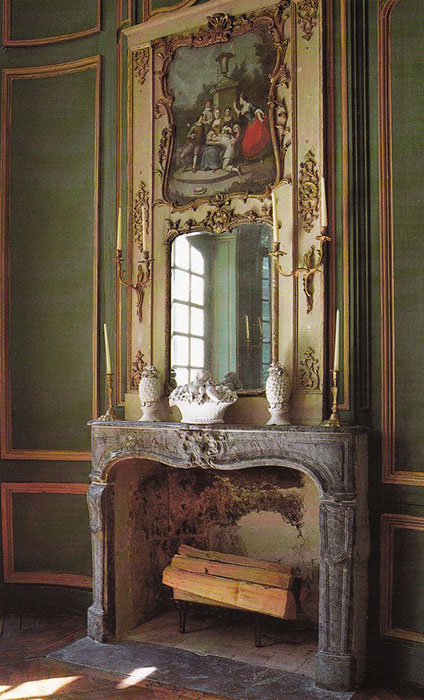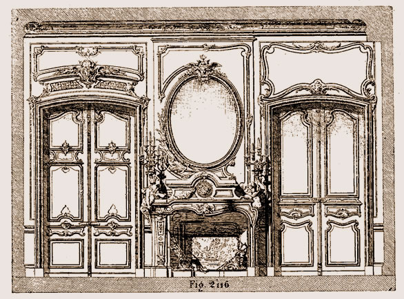 In the beginning of 18th century, under the Regency, the aristocracy has the designers imagining light overmantels receiving broad mirrors, that multiply space and create a fairy world with the reflection of chandeliers. The casing is lowered so that one can enjoy the mirrors. Boffrand’s Regence decorations for the Hotel de Soubise are typical, with a multiplication of mirrors decorated with garlands.