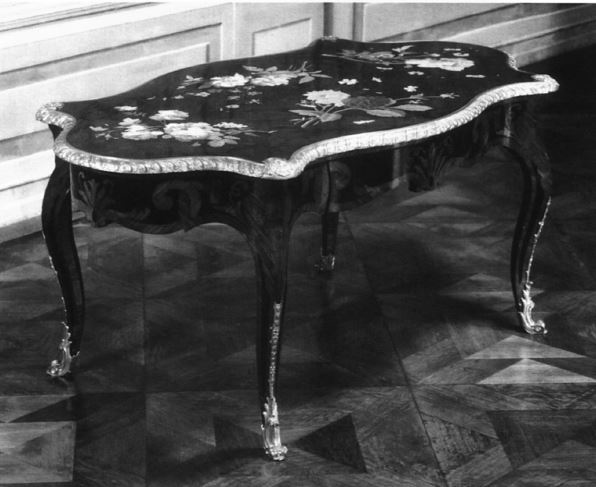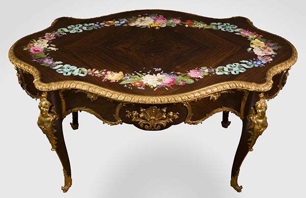 In particular, he signed the flowers adorning Empress Eugénie’s Jewel Case, which she bought after the World’s Fair of 1855 , and is today kept at the National Museum of the Chateau of Compiègne. In 1852, he painted the inlays of a table preserved in the Murska Sobota Museum (Slovenia), then in 1853, those to be inlaid by Tahan in an impressive flat desk, entered in the Marc Maison Gallery collections. The Gallery contributes in a continuous research to identify his various contributions to Rivart’s porcelain inlays, and also identified his signature on a pair of side cabinets, signed 1854.