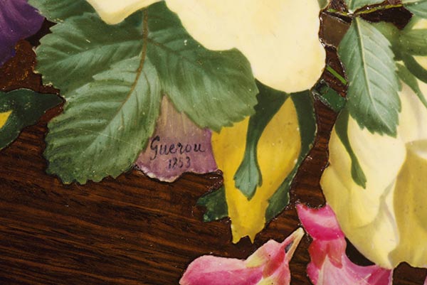 In the year 1849, Guérou sent two porcelain paintings to the annual Salon of the Tuileries Palace, Bouquet of Flowers and Flowers and Fruits. The exhibition opens on June 15, and it is perhaps there that Julien-Nicolas Rivart prospects to find a collaborator in porcelain decoration. The latter registered on next September 18th a patent for a new method of inlaying porcelain in wood and in all other types of materials. Shortly afterwards, Pierre-Joseph Guérou was his collaborator in a bold and successful undertaking, the Rivart porcelains enjoying great enthusiasm.
