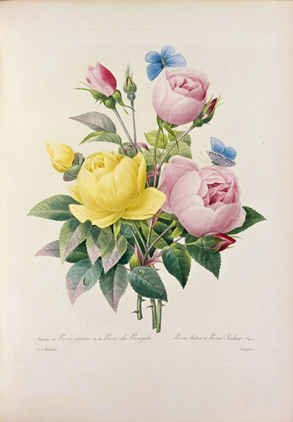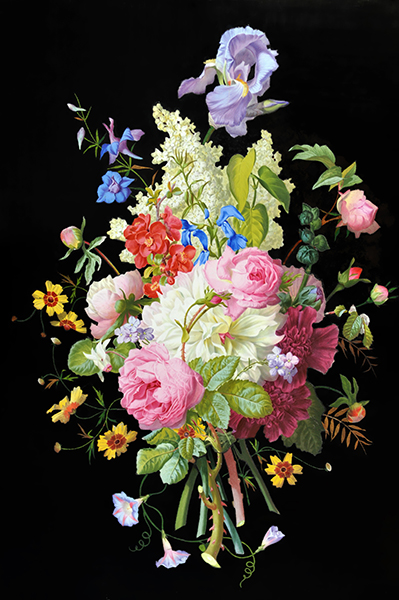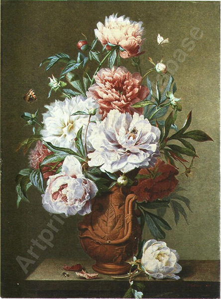 A painter of flowers, Pierre-Joseph Guérou perpetuates a difficult art to which Pierre-Joseph Redouté, "the Raphael of flowers", had given its nobility in the Age of Enlightenment, both by the illustration of the most important botanical textbooks, and by painting. Classified as a minor genre of painting, landscape becomes a noble and grandiose subject with the romantics. Thus, in 1849, George Sand had seen Delacroix "in ecstasy in front of a yellow lily whose beautiful architecture he had just understood" (La Revue des Deux Mondes, June 1, 1860). The painting of flowers is thus revalued by this poetic sensibility, and invades the interiors decoration. It is also not uncommon for small merchants to commission flower paintings from young bohemians for their clientele.
