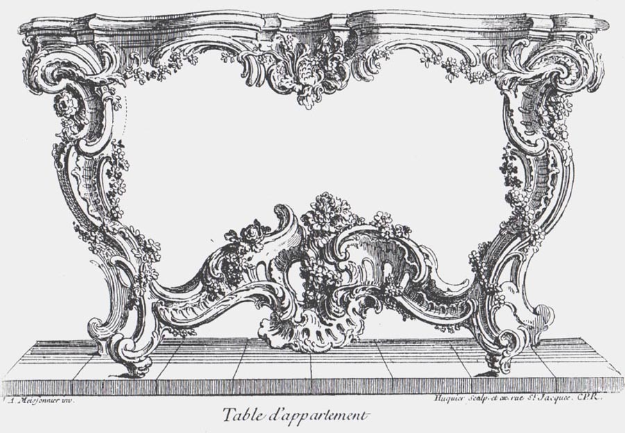 Marked by a wind of freedom and gallantry, the Regence style thus keeps, between 1700 and 1730 approximately, the vocabulary of the Louis XIV style and preserves its symmetry, while it curves the lines and brings new thin sculpted motifs. From this union between curves and symmetry results a softness preserving great harmony. The designers Oppenord, a pioneer, and then Meissonier and Pinault, creators of Rococo, dominate the period. Let us quote among the most fashionable motifs: shells, Acanthus leaves, palms, curved foliage, bearded or women heads, flowers, rocks, fruits; associated by contrast with geometrical backgrounds – especially in marquetry works – privileging squares and diamonds. The chinoiseries that will be distinctive of 18th century are also increasing : pagodas, monkeys, peacocks… To Louis XIV style ’s heroism and solemnity succeeds the stressing of sociability, playing and the aristocratic spirit.