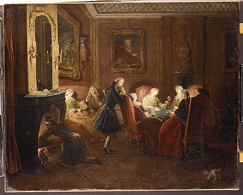 Emblematic among all, the shell, surrounded by volutes or foliage, spreads on chairs and armchairs, paneling, fireplaces, brackets and drawers. These elements are seen on fireplaces, more curved, decorated with shells and whose overmantel prefers now mirrors to stone, as one can see in a genre scene painted by Dumesnil.