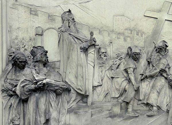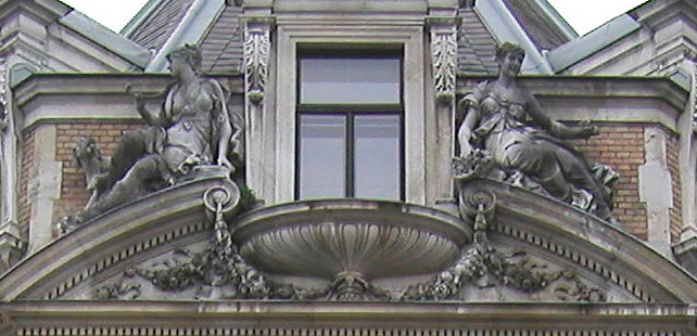 For the city of Vienna, he made the statue of Charles VI of the Kunsthistorisches Museum (facade of the Maria Theresa square), the decoration of the Natural Museum cupola, two bas-relief for the University (Prosperity and Industry), and two other reliefs for the bronze door of Equitablepalais (1890/1891). From 1894 to 1898, he realized two bronze lions for the Nussdorf docks, as well as a Magyar soldier for the Neue Burg front. Last but not least, Saint Peter’s Church of Vienna is decorated with a bas-relief by Weyr, depicting the legend of its founding by Charlemagne. In several of these works, one can notice the artist’s affection for folkloric costumes, in particular on the Magyar statue and St. Peter’s bas-relief.