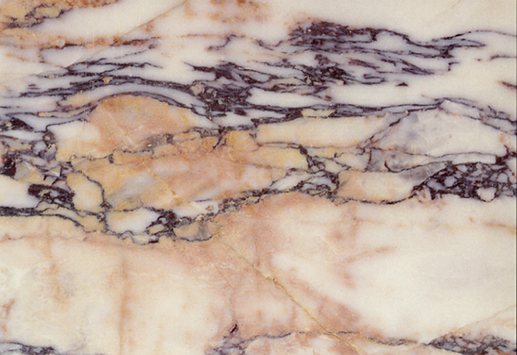 Syros marble is a very crystalline limestone with a breche-like aspect and veins of black mica (biotite) with an alignment of minerals.