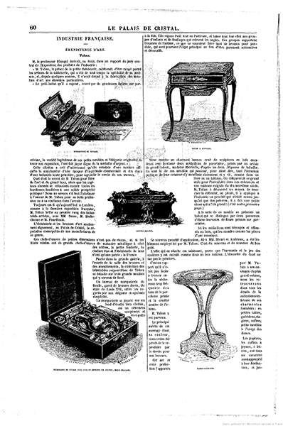 A gold medal at the World’s Fair of 1867 , Tahan employed more than two hundred employees in several workshops at the end of the Second Empire. Tahan is, like Rivart, an enthusiastic spirit about the inventions of the second half of the nineteenth century, and himself deposits a patent for the cylinder rack, and another for document holders with translucent facade in 1858.