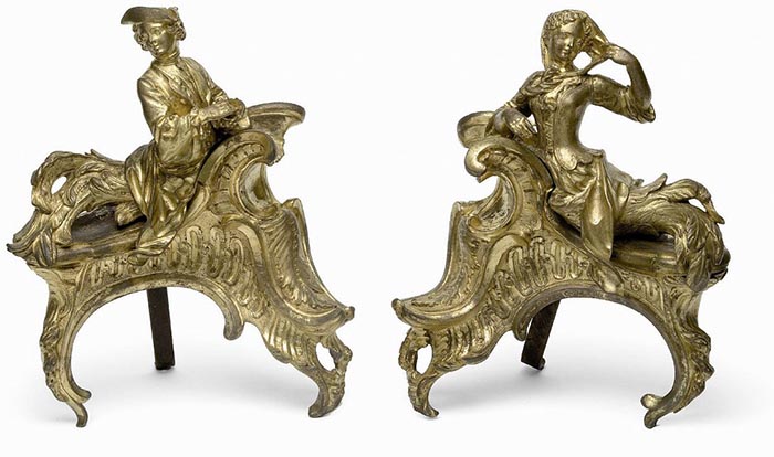 The Louis XV style combines the flame-like shapes with the gilt bronze which gleams by the fire. The sinuous forms can sometimes be self-sufficient, but they often accommodate couples of animals or characters who respond, sometimes enhanced by a darker patina. On the andirons there are scenes of children's play, rest, gallantry or hunting. Jacques Caffiéri's Italian joyful temperament is fashionable and the fireplace becomes a place of conviviality and intimacy, with, for example, his pair of firedogs "Rooster" and "Hen" representing a gallant scene between two young people.