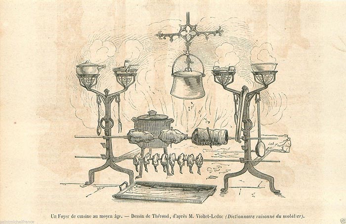 The utility of the andirons quickly became obvious. The ruins of Pompeii show that lifting fire on iron bars was already a known process in the Antiquity. In the Middle Ages, the andirons are very tall, as are the fireplaces, and are equipped in the kitchen with receptacles to keep dishes warm.