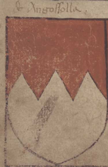The arms of the Anguissola, on the left are: party per fess, indented, gules and argent.
