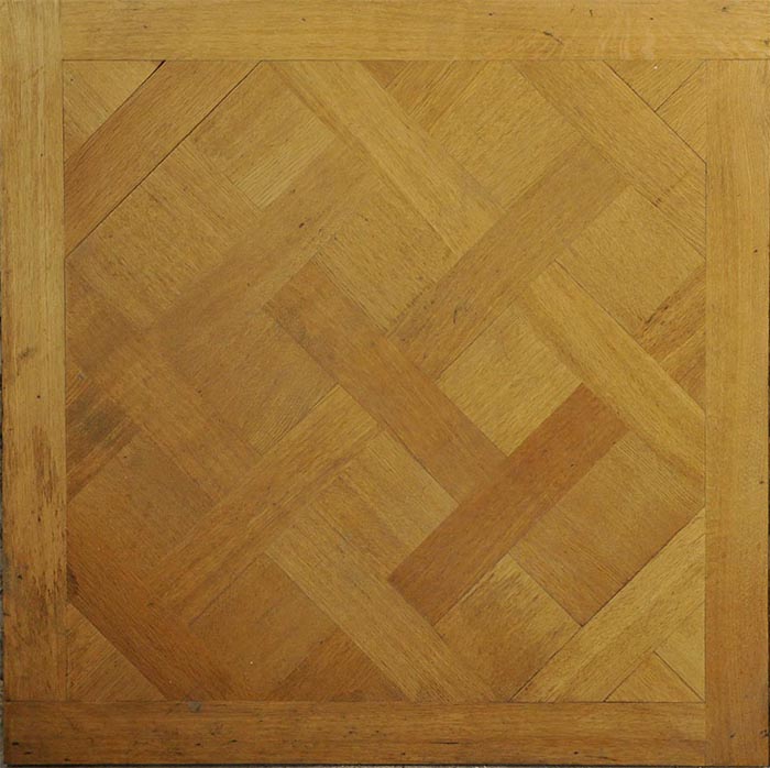 Named “French style parquet” (“parquet à la Française”) in 17th and 18th centuries, sometimes “thumbed compartment parquet” (“parquet à compartiments à l’onglet”), the parquet de Versailles is distinguishable by its square panels (composing the entire parquet), always counting 42 mortices, 42 tenons, and 42 dowels, hand assembled with no glue, and waxed. The dowel fixing mounts and tenons guarantee the authenticity of the fabrication procedure. Most of the time in plain oak, this parquet is generally posed in diagonal in function of the room, but the original rule is to arrange it starting from the fireplace.
