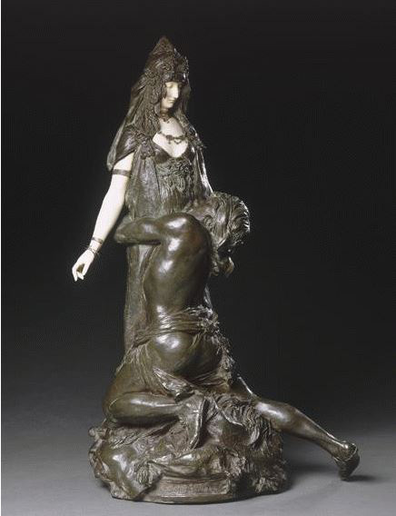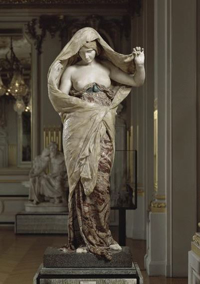 Artists redoubled refinements and innovations for this unique event. One example is Barrias’ sculpture, Nature unveiling in 1899, a work in polychromic marble and onyx from Algeria, Malachite and Lapis lazuli.