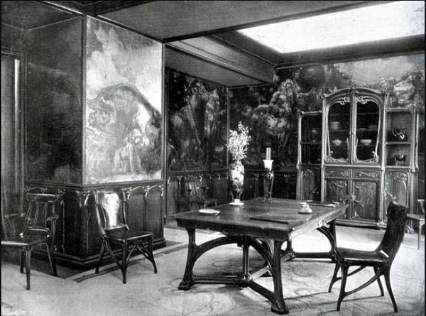 Art Nouveau triumphs, including the "Art Nouveau" pavilion by Siegfried Bing, decorated by De Feure. It exhibits interior decorations by Eugène Gaillard, Edward Colonna and Georges De Feure. Thus, in the field of furniture, Louis Majorelle acquires an international reputation, while Emile Gallé is consecrated by two great prizes and a gold medal. The Pérol Frères house also exhibits refine-lined designs. At François Linke’s stand, master of the Louis XV style and neo-rococo style, we also see extraordinary pieces, where the new style brings to a new dimension the fantasies of the eighteenth century.
