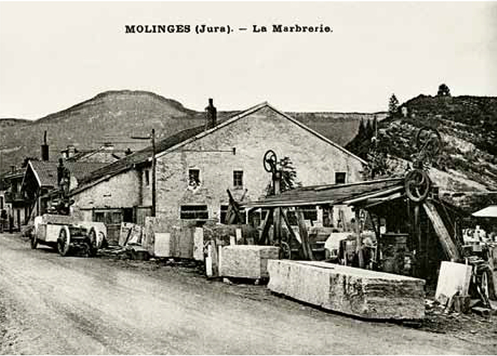 It is extracted from the quarries of Pratz in the Haut-Jura, of which the most important is the quarry of Champied, open from the end of the 19th century until the end of the 1930s.
